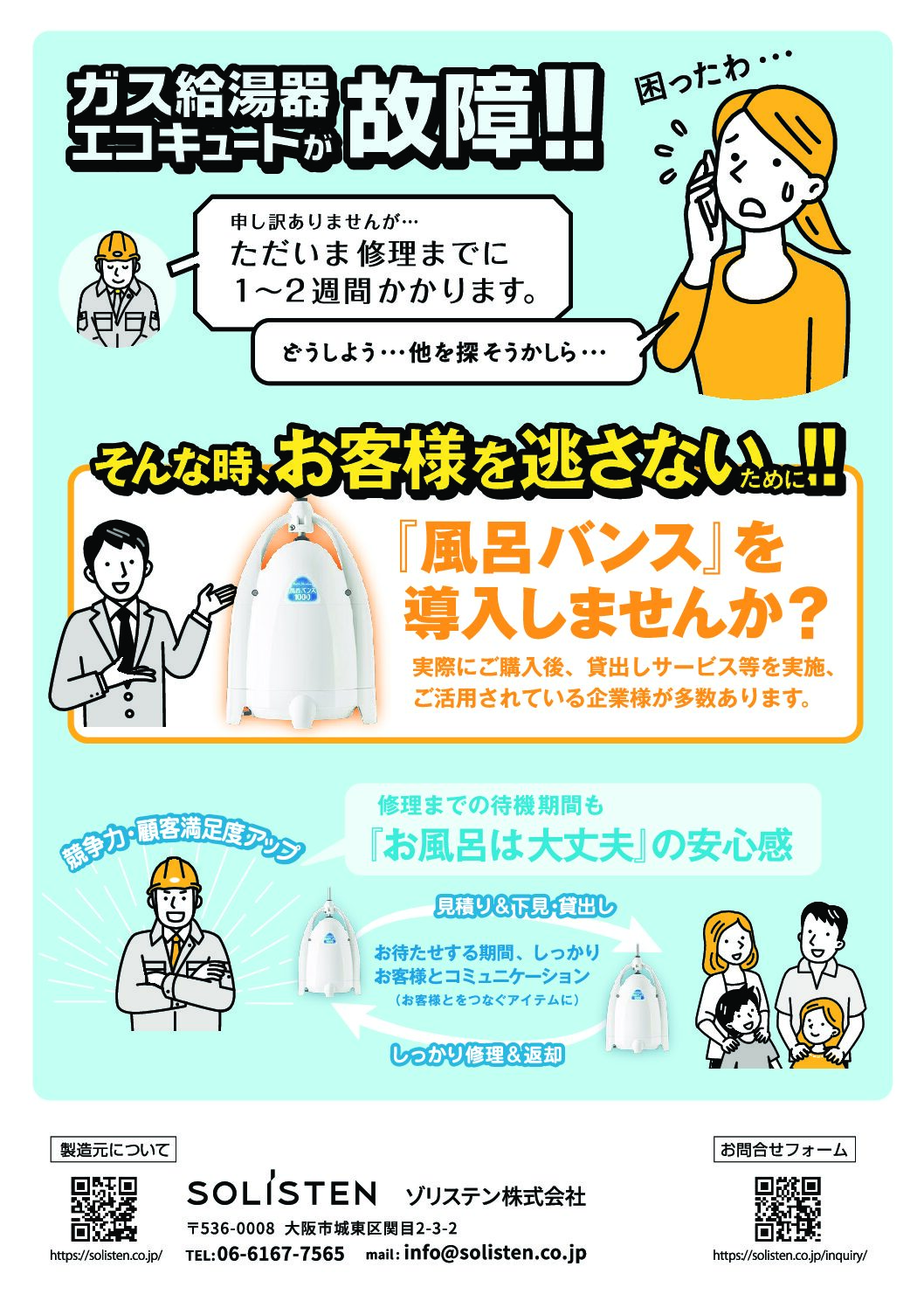 企業の皆さまへ 風呂バンス1000導入により業績がアップした事例をご紹介 2025.11.06 風呂釜・給湯器やエコキュートの交換・故障時にお客様へ工事が完了するまでの期間、風呂バンス1000を工事業社が購入し、お客様に貸出するサービスをする事でお客様を逃さないという事例が広がっています。お困りのお客様も入浴が出来て安心、工事を請け負う企業様からもお喜びの声。『風呂バンス1000』の活用を是非ご検討してみませんか。
